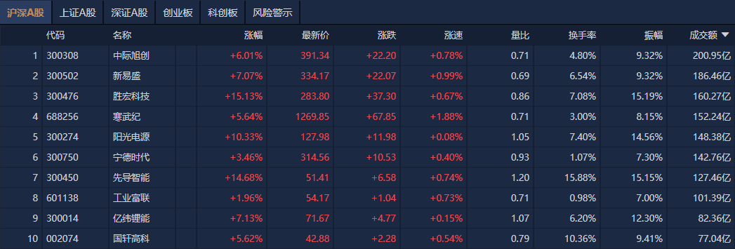 个股方面,中际旭创成交额超200亿元居首,新易盛、胜宏科技、寒武纪成交额靠前。